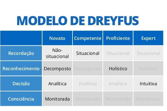 Em 1980, os irmãos Stuarty e Hubert Dreyfus(filósofo) desenvolveram um modelo de aquisição de novas habilidades, chamado Modelo de Deyfrus. O modelo foi construído baseado nos campos da educação levantando como os estudantes adquirem habilidades através de instrução formal e prática, dividido em 5 níveis, da razão a intuição: Novato, Iniciante, Competente, Proficiente e Expert. Vejamos cada nível!